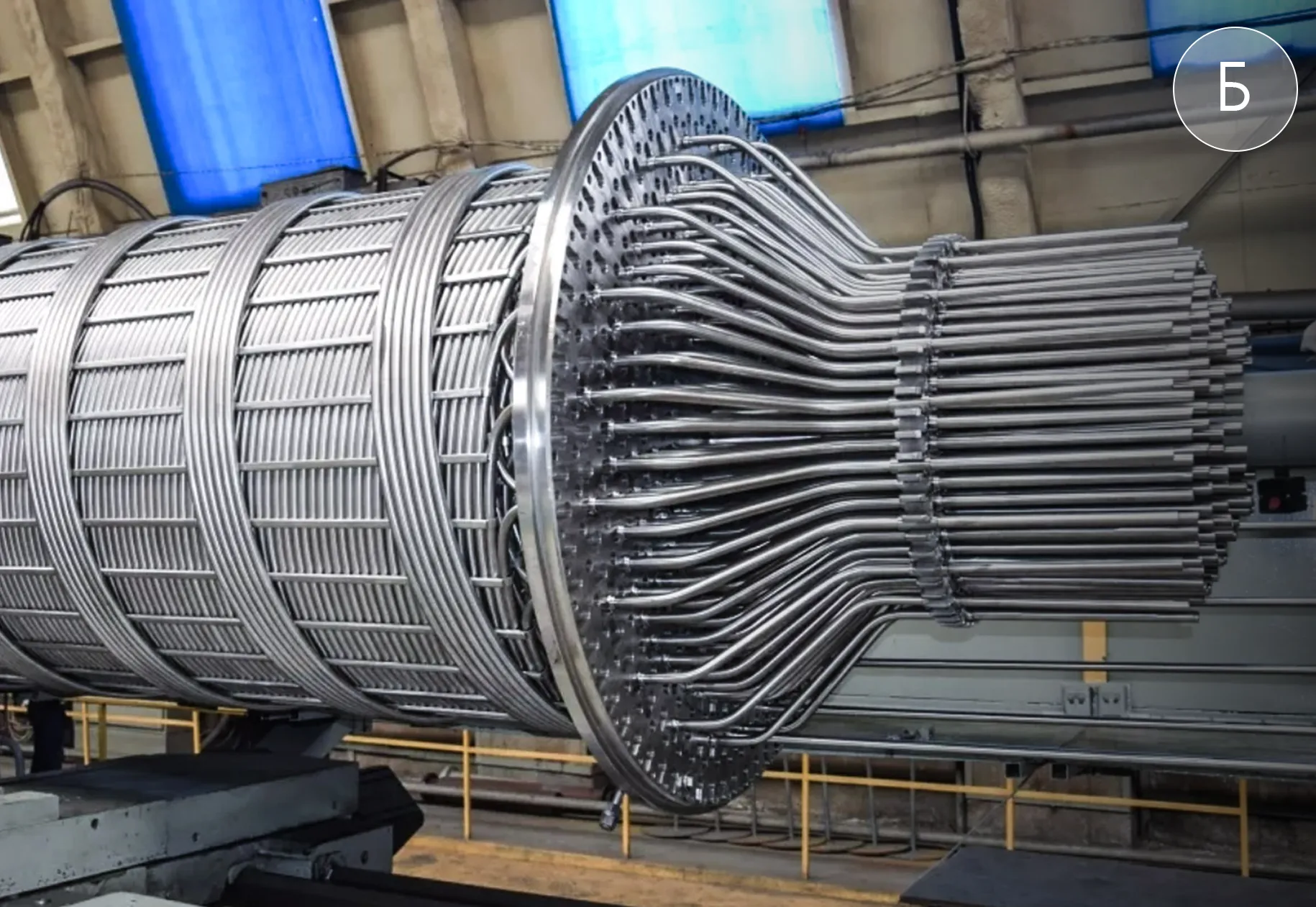 На снимке А представлен блок пластинчато-ребристых теплообменных аппаратов. Теплообменники данного типа используются в составе установок низкотемпературной ректификации, сжижения природного газа, на газохимических и химических производствах. Плоские разделительные листы и гофрированные ребра образуют параллельные проточные каналы для различных потоков сред. Для получения двух- или многоходовых аппаратов каналы соединяют между собой различными способами. Теплообменной поверхностью является поверхность разделительных листов между двумя потоками. Соединение разделительных листов с гофрированными листами и перегородками в единый герметичный монолитный пакет осуществляется бесфлюсовой пайкой в вакуумных печах.