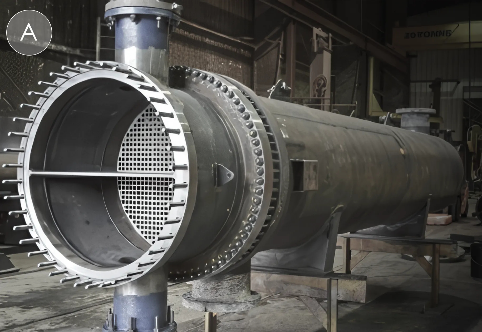 На снимке «А» представлен кожухотрубчатый теплообменный аппарат, широко применяющийся в нефтегазовой промышленности. Его основными преимуществами являются ремонтопригодность, простота конструкции, широкий диапазон рабочих параметров.