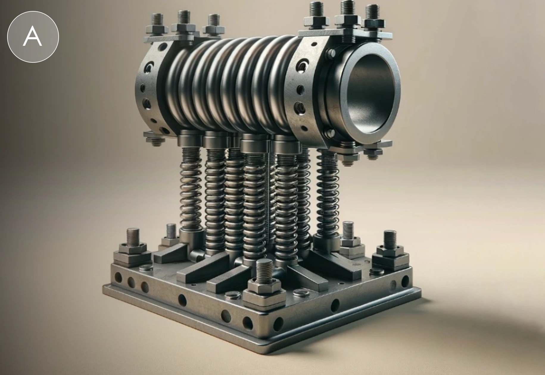 На снимке «А» представлена пружинная опора. Пружинные опоры используют при монтаже трубопроводов для фиксации труб и компенсации нагрузок, возникающих из-за теплового расширения, давления, вибрации и прочих внешних воздействий. Пружинные опоры представляют собой плиту основания с одним или несколькими пружинными блоками.